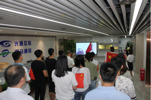 全体员工举行升旗仪式,奏唱国歌,行注目礼。